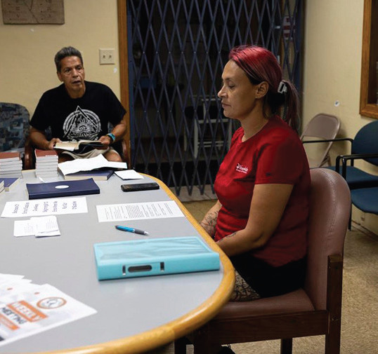 Tracy Germait, right, leads a Cocaine Anonymous meeting with Mark Stevens, co-chair of the group, left, on Aug. 12, 2025, at MannaFest Church in Green Bay, Wis. (Joe Timmerman / Wisconsin Watch)