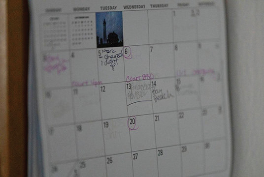 A calendar hangs on the wall at Tracy Germait’s transitional housing unit Aug. 12, 2025, in Green Bay, Wis. (Joe Timmerman / Wisconsin Watch)